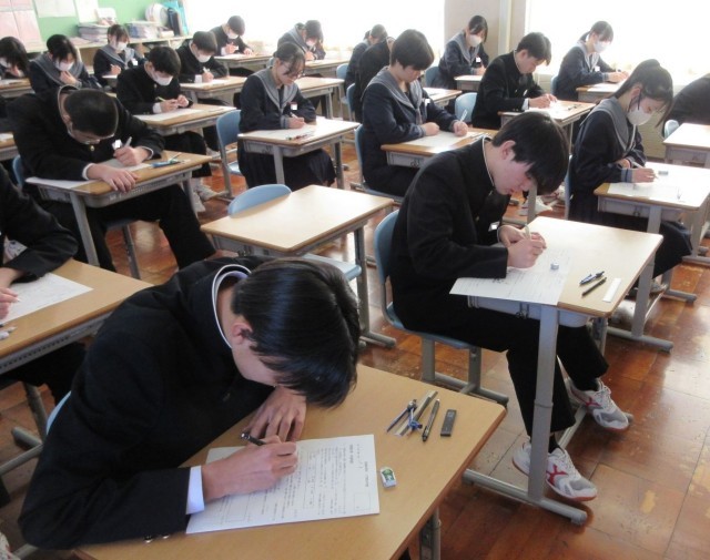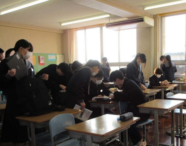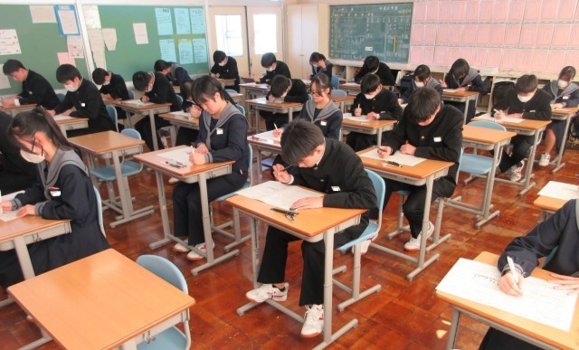 10日、12日と期末考査を行いました。3年生にとっては、中学校生活最後の定期テストとなりました。登校するとすぐに教科書を開き、見直しを入念に行う姿が見られました。また、テスト中は、どの生徒も粘り強く問題に向き合い、教室には鉛筆を走らせる音だけが静かに響いていました。