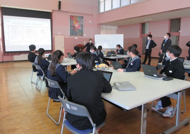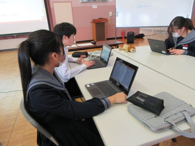ICT支援員さんから、生成AIのしくみや利用時のルールなどを教えていただきました。生徒は体験を通してAIの便利さを感じるとともに、「情報の真偽を見極めること」「最後は自分で判断すること」の大切さを実感していました。