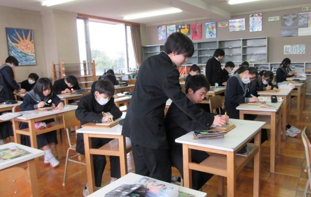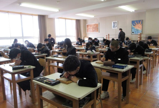 生徒たちは、片切り彫りや薬研彫りなど様々な技法を学び、安全に配慮しながら練習に取り組んでいました。彫り方のポイントや技法に合った彫刻刀の選び方について、友達にアドバイスする姿も見られました。