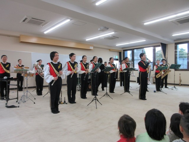 庄南小学校にご招待いただき、11月22日に大阪城ホールで開催される全日本マーチングコンテストで演奏する「大いなる約束の大地~チンギス・ハーン」など、数曲を披露しました。演奏の最後には、吹奏楽部の伴奏に合わせて、全校児童が「ありがとうの花」を元気に歌い、体育館は温かい雰囲気に包まれました。