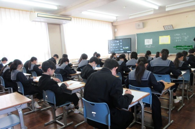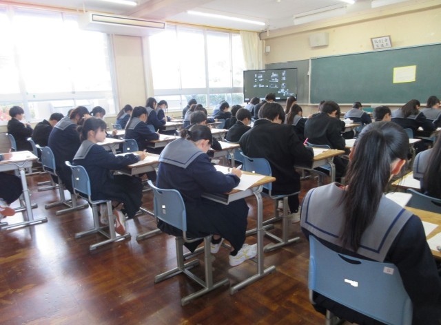 今日、明日と中教研学力調査を行っています。生徒たちは真剣な表情で問題に取り組んでいました。