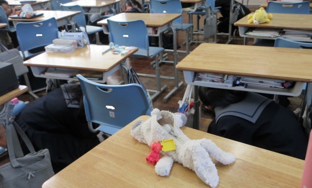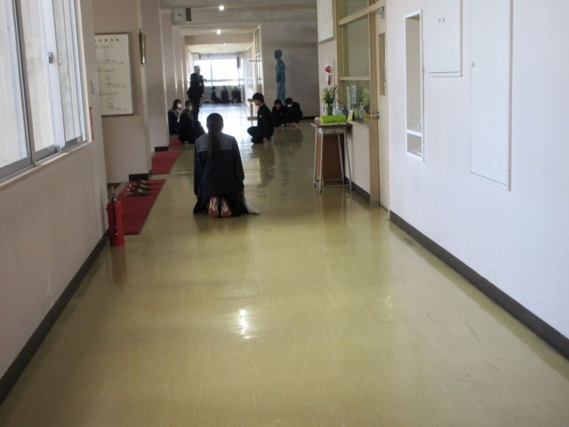 「休み時間中に地震が発生した」という想定で避難訓練を行いました。生徒たちは、机の下に身を隠したり、その場で姿勢を低くしたりと、それぞれが状況に応じて身を守る行動を判断する様子がみられました。