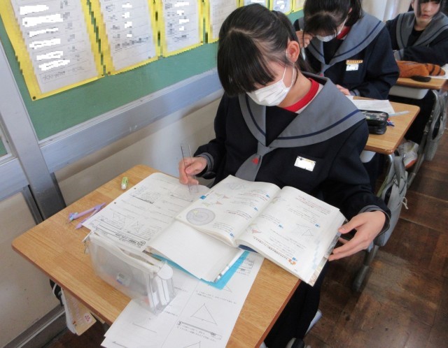 プリントを使って作図等の復習をしました。教科書やノートで既習内容を振り返りながら、粘り強く取り組んでいました。