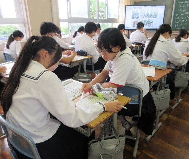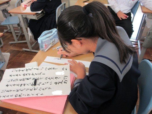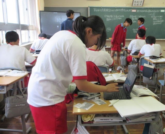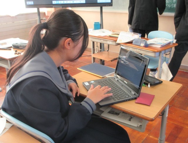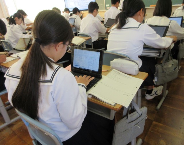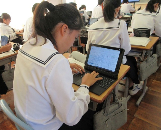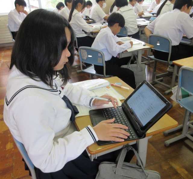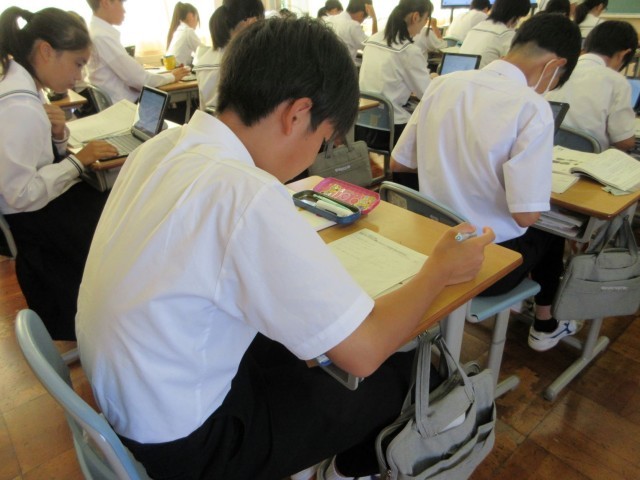 静まり返った教室で、生徒たちは黙々と学んだことをワークシートに書き加えたりタブレット端末に振り返りを入力したりしていました。