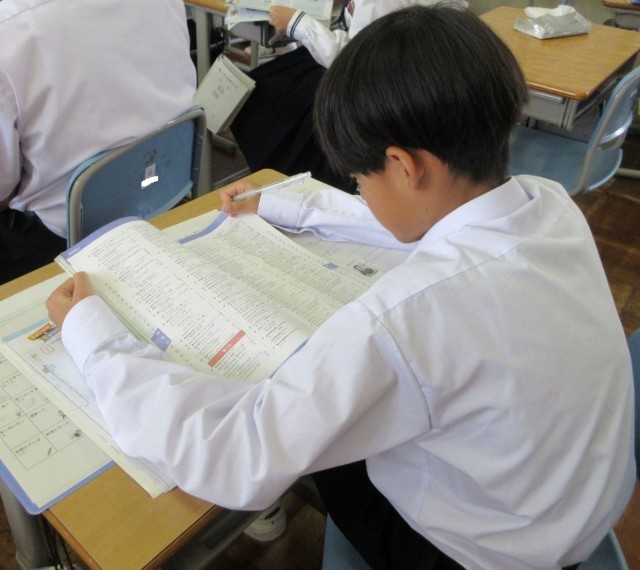資料を読み取ったり、友達と意見交換したりしながら、自分の考えをノートにまとめる姿が見られました。