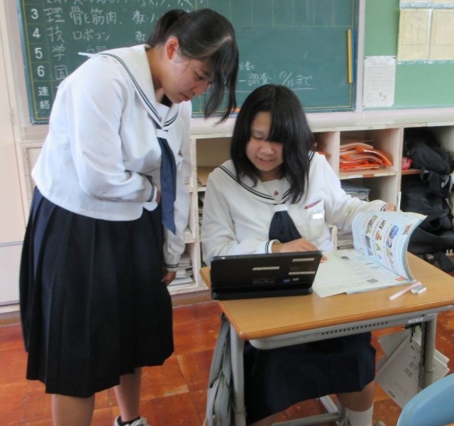 目的地に応じたルールを設定するためタブレット端末を使って現地の情報を調べたり、教科書で英単語を確認したりする姿が見られました。