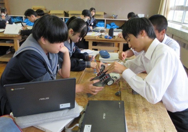 教科書やタブレット端末で調べたり、友達と話し合ったりしながらロボットを製作に取り組んでいます。試行錯誤を重ねる中で、ものづくりの楽しさを味わってほしいと思います。
