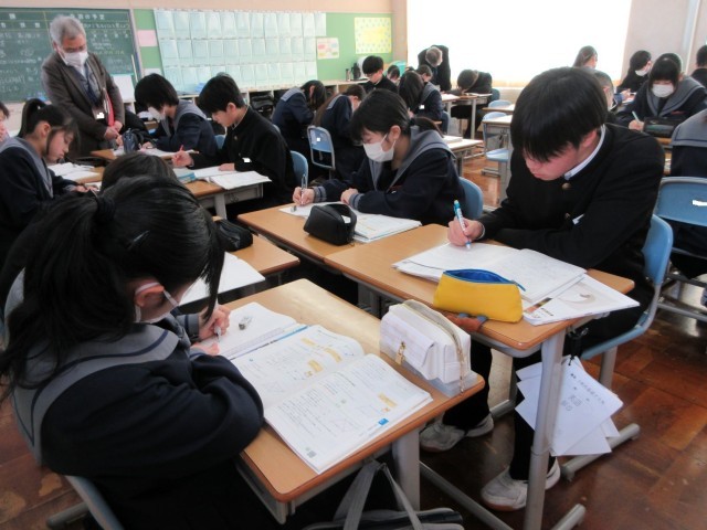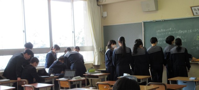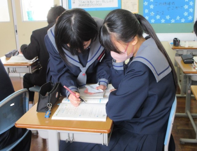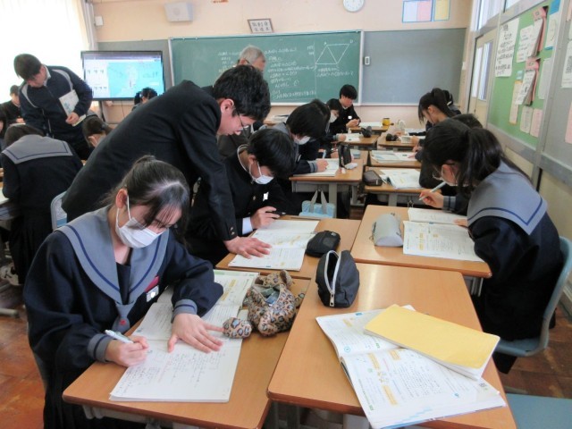 ワークシートで1問解くごとに、他の人へとシートを回しながら学習を進めました。受け取った生徒は、前の人の解答を確認したうえで、新しい1問に取り組み、再びワークシートを次の人へ渡します。
