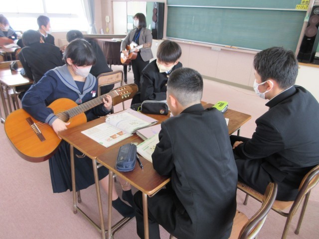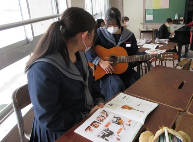 ギターの演奏に挑戦しています。「どうやったら『ド』の音が出る?」と、何度も弦を弾き、耳を澄ませて音を確認する様子が見られました。