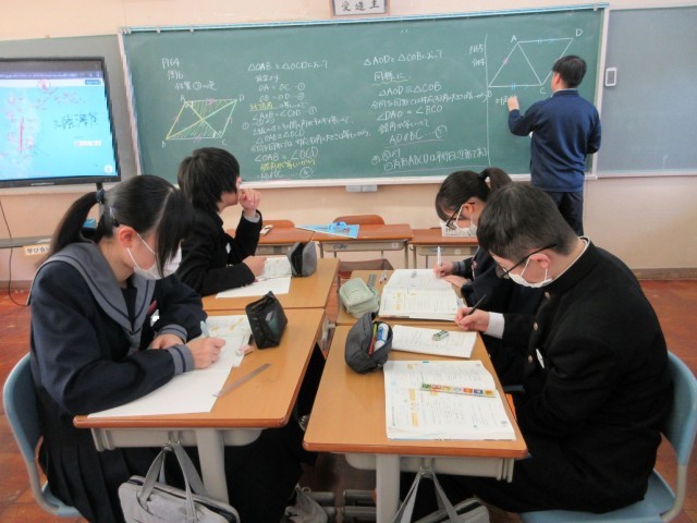 平行四辺形になるための条件を導き、証明しました。これまでに学習した図形の性質や証明の進め方を生かし、粘り強く取り組んでいました。
