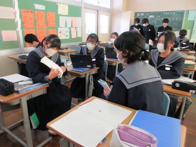 「走れメロス」を題材に問題づくりを行いました。生徒は自分がつくった問題を友達に出し、答えとその根拠となる叙述を答えてもらうとともに、その問題が適切かどうかについて評価し合っていました。