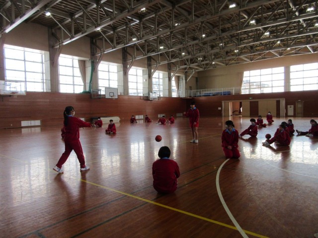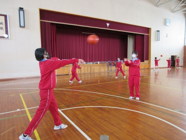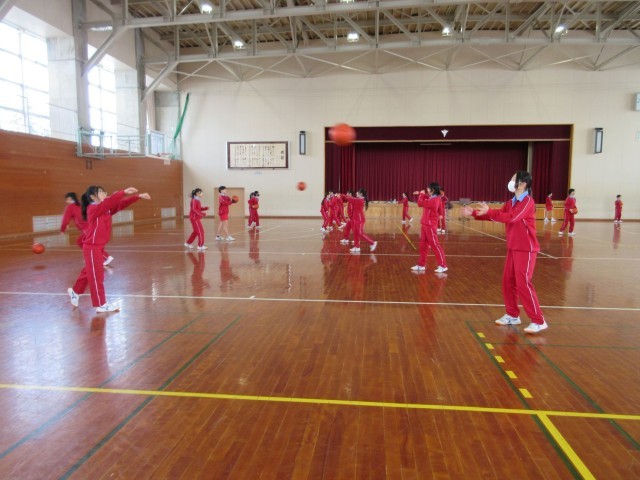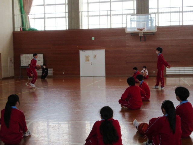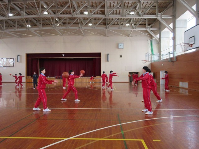 パスなど基本的な技能を身に付けるための練習をしました。バスケットボール部の生徒が手本を示し、他の生徒たちは足の動きや手の使い方といったポイントを意識しながら練習に取り組んでいました。