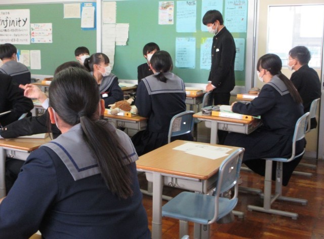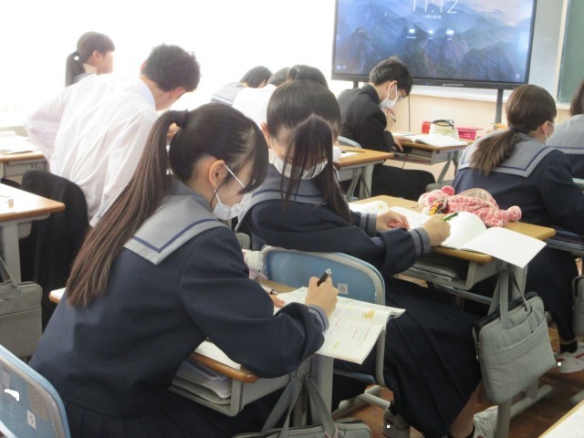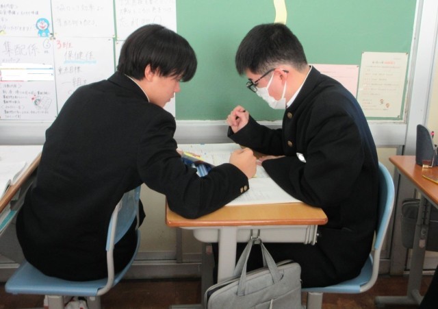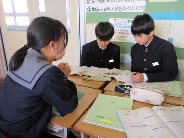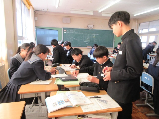 章末のまとめの問題に取り組みました。生徒自身が「一人で考える」「二人で考える」「みんなで考える」という学習形態を意識して使い分けながら学習を進めていました。