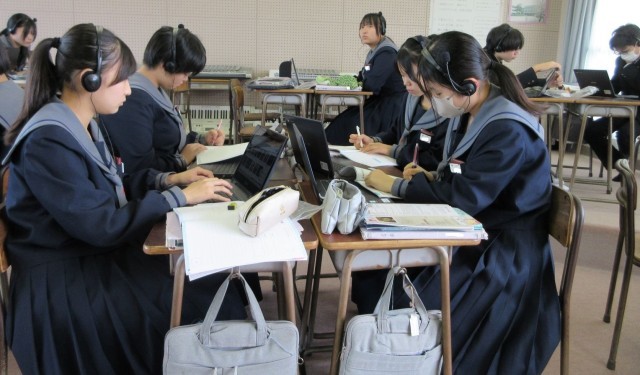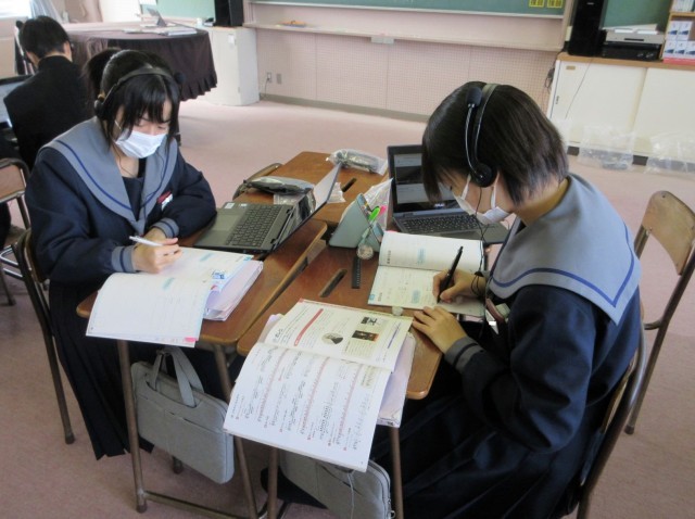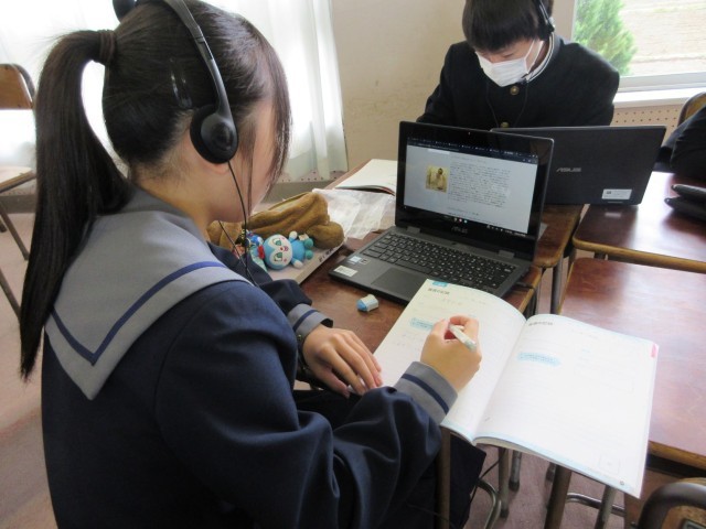 課題「オーケストラの魔術師と呼ばれたラヴェル~オーケストラ用に編曲した作品のよさをまとめよう~」に取り組みました。自分が聴きたい箇所を何度も聴き返しながら黙々とよさをまとめる生徒、曲に合わせ指揮をしたり、友達と作品のよさを話し合ったりしながらまとめる生徒など、自分に合った方法で学習を進める姿が見られました。