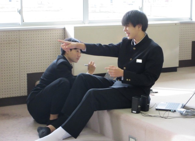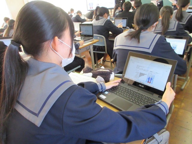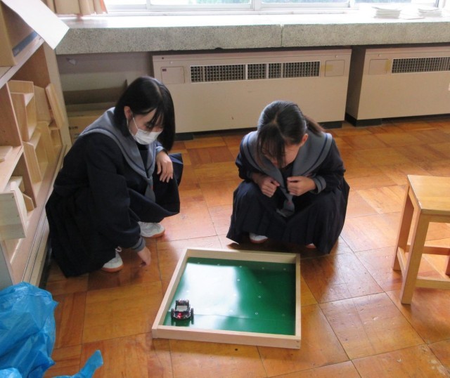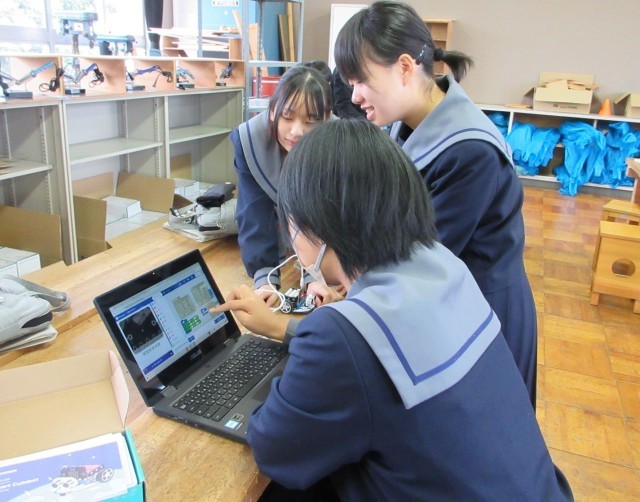 プログラミングの学習中、「うまくいかないのは、どうして?」「分かった。○○にすればいい。」という声が聞こえてきました。しばらくすると、「できた。やってみよう。」という言葉も。試してみたものの、結果はうまくいきませんでした。しかし、あきらめる様子はなく、試行錯誤を重ねながら粘り強く取り組んでいます。そんなときの生徒の表情はとても生き生きとしています。