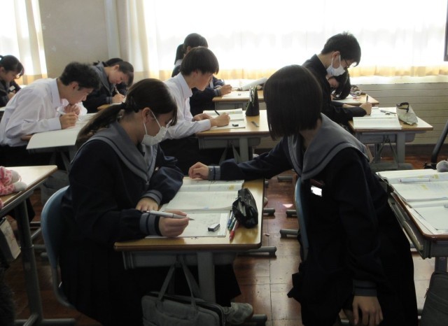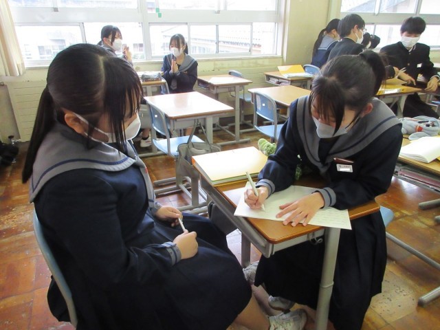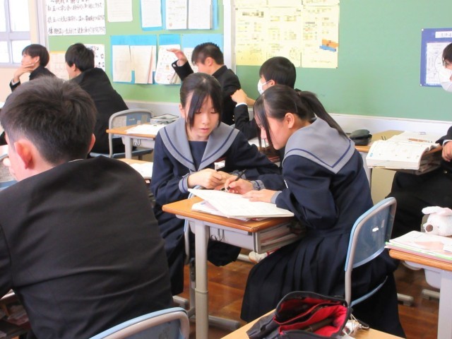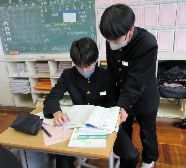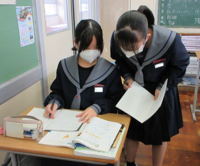 分からなくて困っている友達に「この図を抜き出してかいてみるといいよ」と声をかけている生徒の姿に、「自分で解決できるように」という思いやりの気持ちが感じられました。