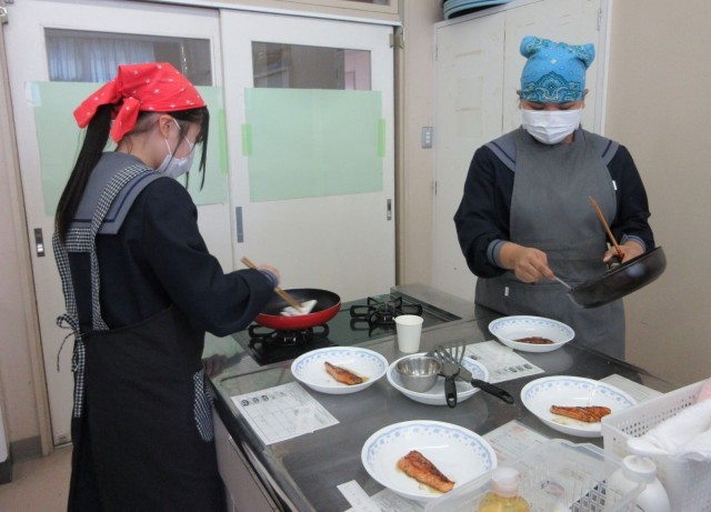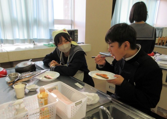 鮭のムニエルを作りました。「おいしい」という声にまじって「すっぱい」という声も聞こえてきました。レモン果汁をかけすぎたことが原因で、適量の大切さを身をもって学んだようです。