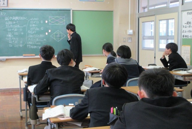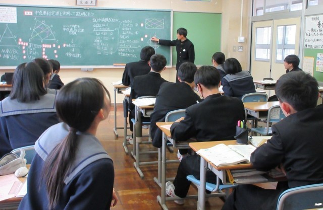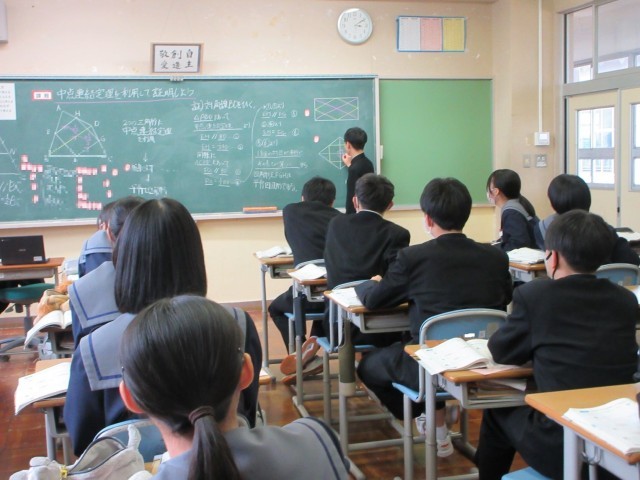 中点連結定理をもとに新たな図形の性質を導き出しました。苦戦しながらも、自分で考え、友達と考え、最後はみんなで考えました。「言っていることの意味がわからない」と恥ずかしがらず、分からないことを率直に伝えられる雰囲気の中、みんなが理解できるようにと前に出て説明する生徒、その説明を補足するためにさらに前に出て説明する生徒、そして真剣に耳を傾ける生徒 ー どの生徒も主体的に学習に取り組んでいました。