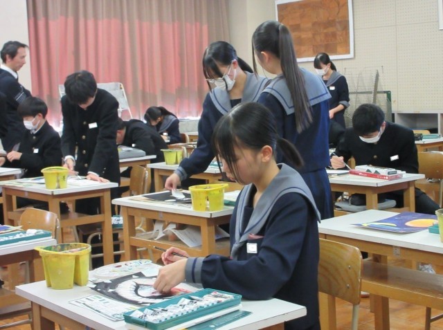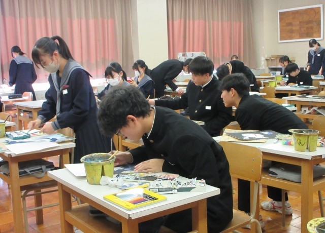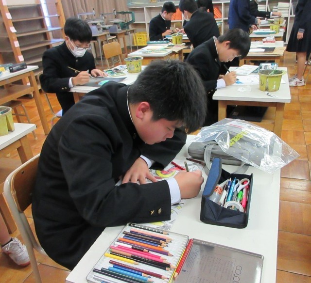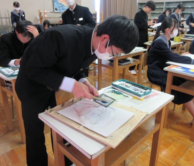 迷ったときには友達や先生に相談しながら、真剣に作品制作に取り組んでいました。表現方法を工夫し、自分らしさがあふれる個性的な作品が仕上がりそうです。