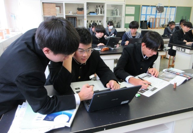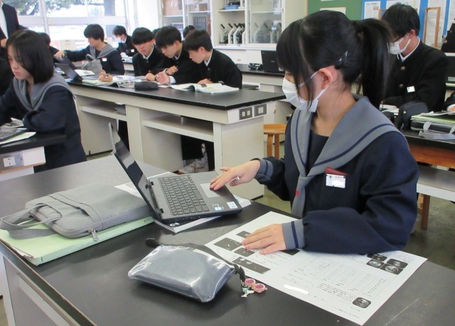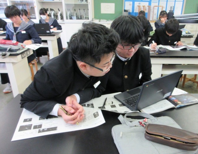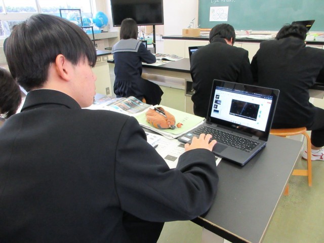 宇宙に存在する天体の数や地球に生命が存在する理由について考えました。生徒は、教科書やタブレット端末を使って必要な情報を収集し、考えをワークシートにまとめていました。