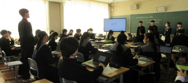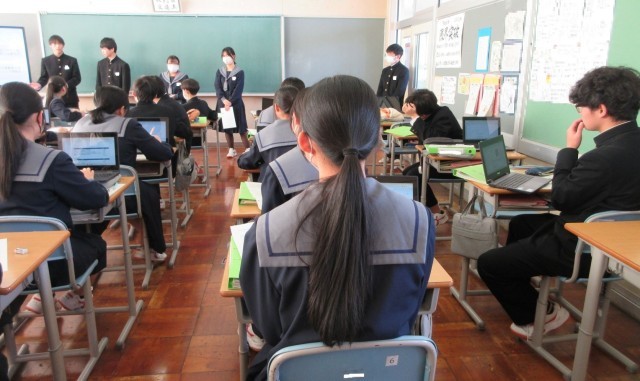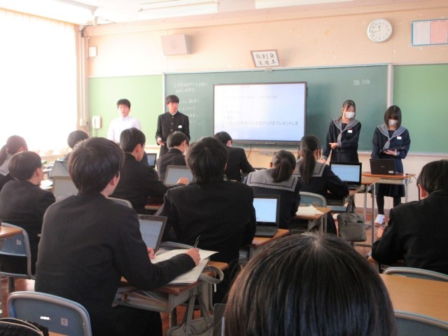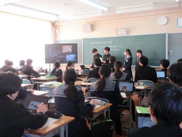 タブレット端末で配信された企画書をもとに、プレゼンテーションソフトを活用して提案を行いました。客観的なデータを根拠に熱心に語る姿や、他のグループの提案に積極的に質や意見を述べる姿から、真剣に砺波市の将来を考える様子がうかがえ、頼もしく感じました。