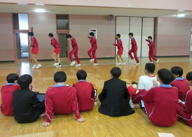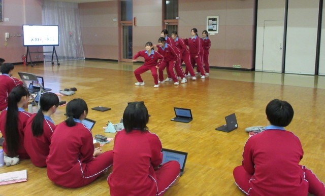 プロのダンスの動画を参考に、動きの組み合わせや隊形移動を工夫しながらダンスを創作しています。どの生徒も、表現活動を楽しんでいる様子です。