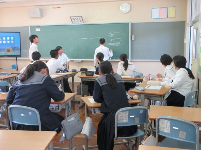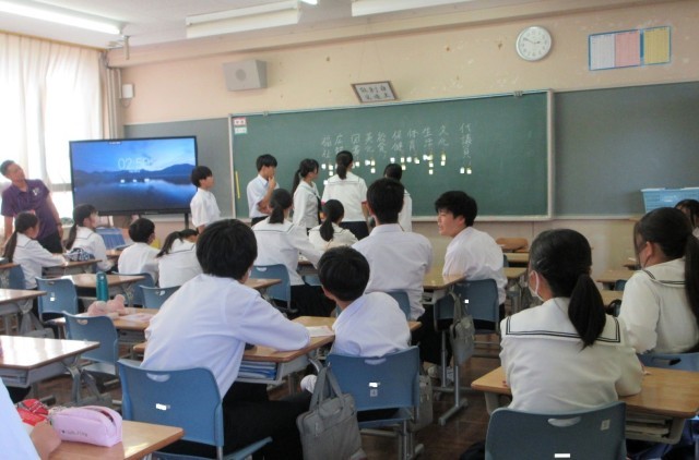 委員長が前期の活動について抱負を述べ、各クラスでは電子黒板に映る委員長の話に耳を傾けていました。