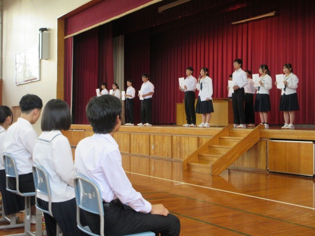 後期生徒会委員長の任命式があり、新委員長が力強く決意を述べました。学校をよりよくしていこうとする熱意が伝わってきました。