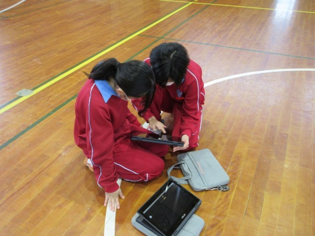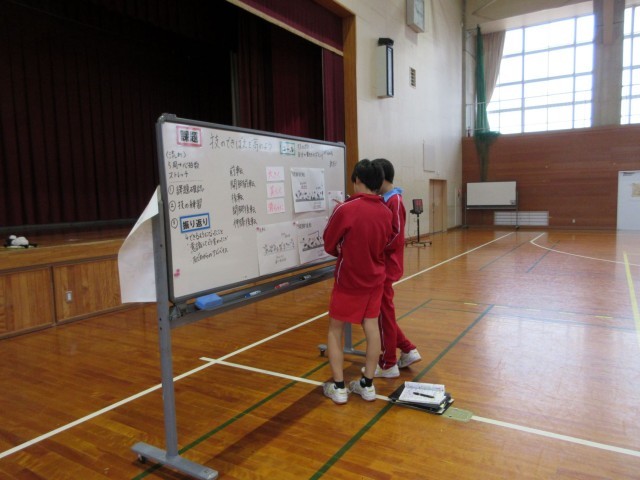 課題「技のできばえを高めよう」のもと、「大きく」「美しく」「滑らかに」を意識して練習に取り組んでいます。タブレット端末で撮影した映像を見ながら互いにアドバイスを交わしたり、ホワイトボードに掲示された技の種類やポイントを確認したする姿が見られました。