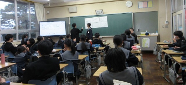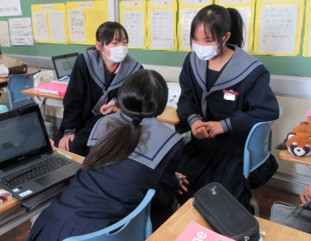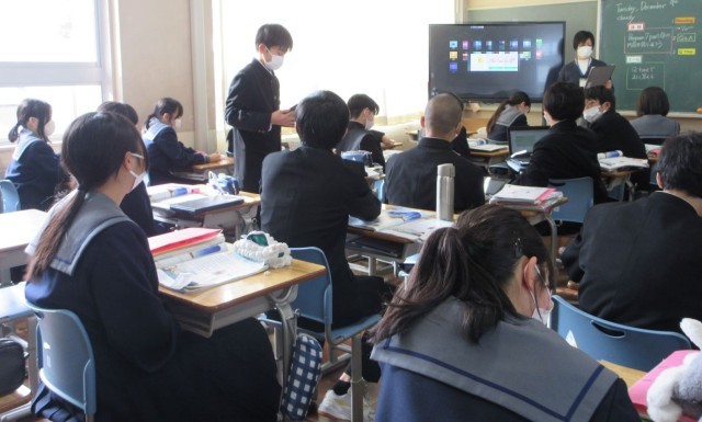 英文の内容をもとに、質問を作ったり、友達の質問に答えたりしました。全体での確認を通して、自分の答え方よりもよい表現に気付き、「あっ、そうか!」と悔しそうに声を上げた生徒もいました。きっと、次はその表現を使えるでしょう。