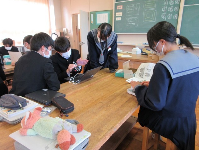 電子黒板や教科書で方法を確認しながら、スナップ付けに取り組んでいました。「難しい」「もう嫌だ」と弱音をはきつつも粘り強く取り組む姿や、友達と教え合う姿も見られました。 -
