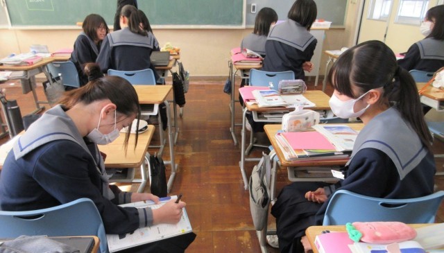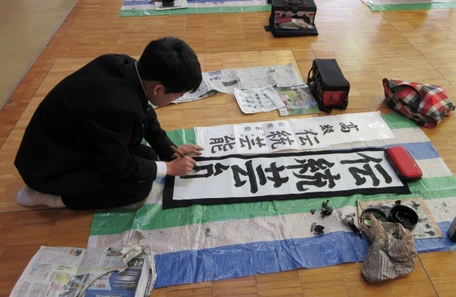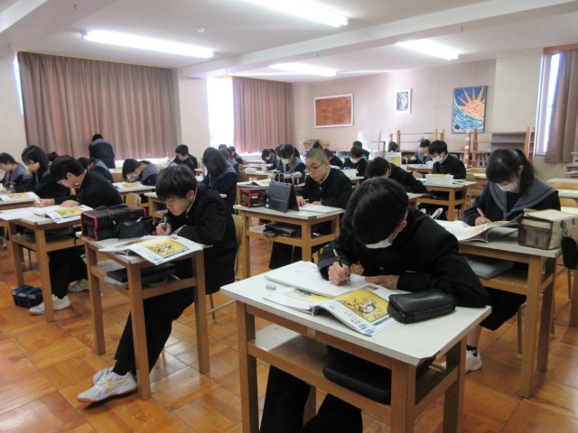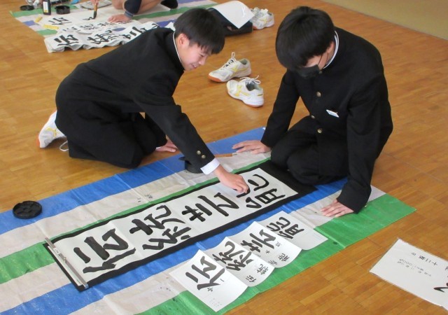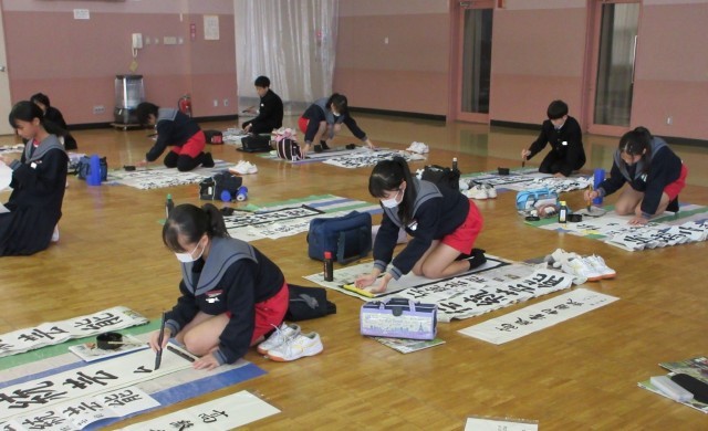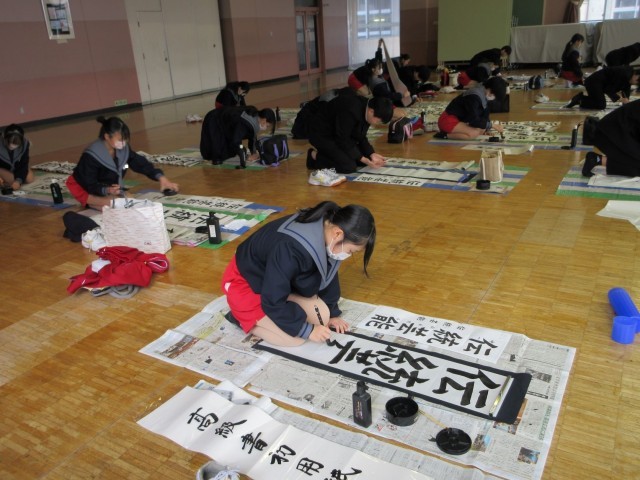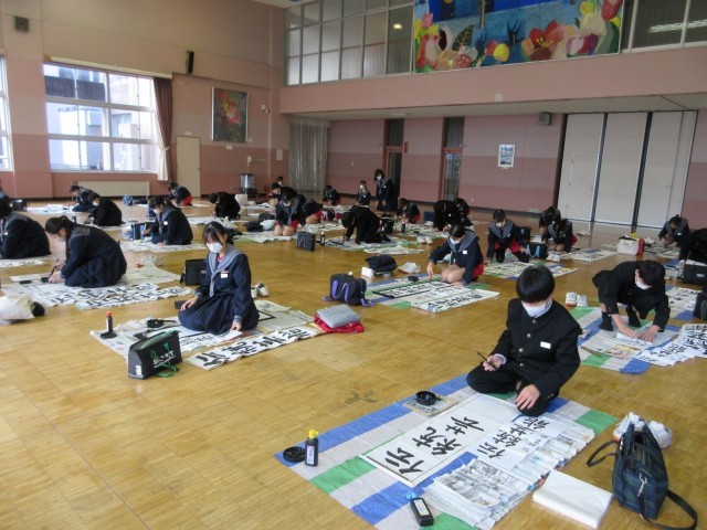 心を落ち着けて書初めの練習に取り組んでいました。書道が得意な生徒にアドバイスを求める姿も見られました。
