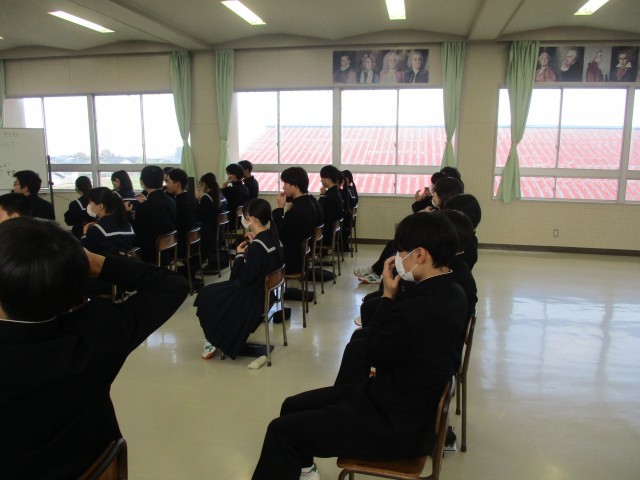 3年生の音楽科の授業です。今日の学習課題は、『ボレロを聴いて、どのような楽器が使われているのかを考えよう』です。タブレットでさまざまな楽器の音色を確認した後、実際にボレロを聴き、使われている楽器を考えながらジェスチャーで表現しました。真剣に聴き入る生徒の姿がたくさん見られました。