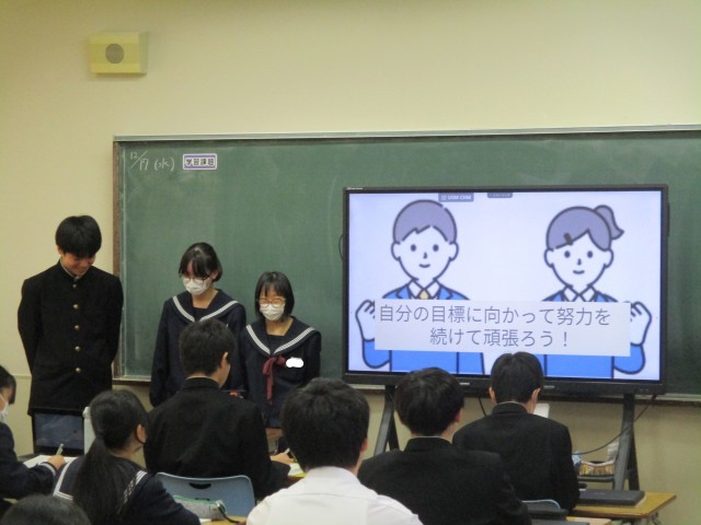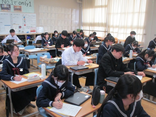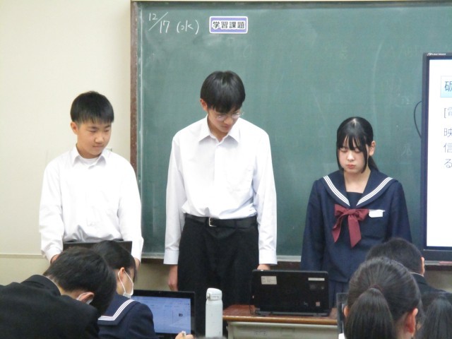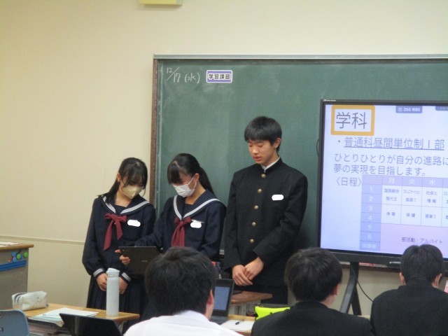 2年生は、これまで調べてきた高校について、プレゼンテーションソフトを使い、グループごとに発表を行いました。どのグループも、学校の概要や特色等を工夫して分かりやすくまとめていました。発表を通して、自分の進路について考えるよい機会となりました。