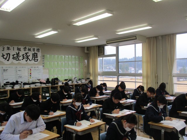 3年生は、今日と明日の2日間で、今年最後の実力テストに臨みます。本日は、社会・国語・理科のテストが行われました。一人一人が自分の目標に向かって、着実に前進していくことを願っています。