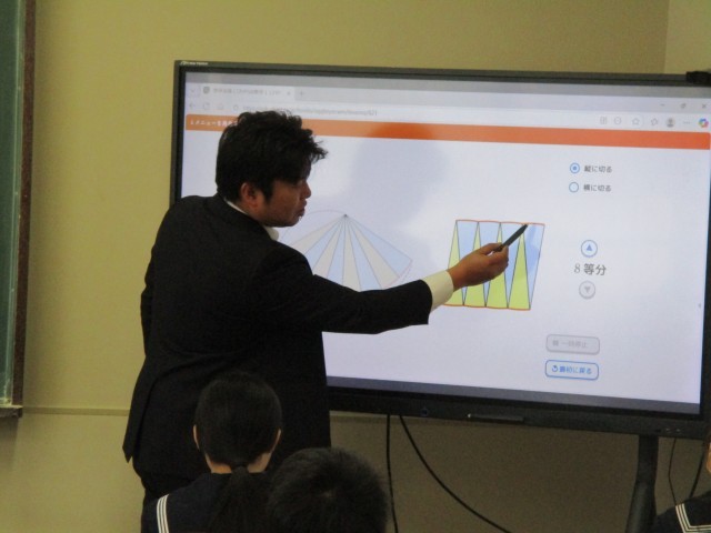 1年生の数学科の授業では、おうぎ形の面積の求め方を学習しています。今日は、アニメーションを活用し、おうぎ形を頂点を中心に分割して変形することで、平行四辺形になることを理解しました。生徒は、その関係をもとに、おうぎ形の面積をどのように求めるのかを考えました。