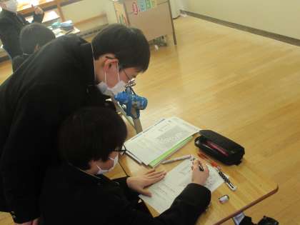震源地や各地の地名が示されているワークシートに、各地の地震到達時刻を書き込み、地震の伝わり方について考えました。