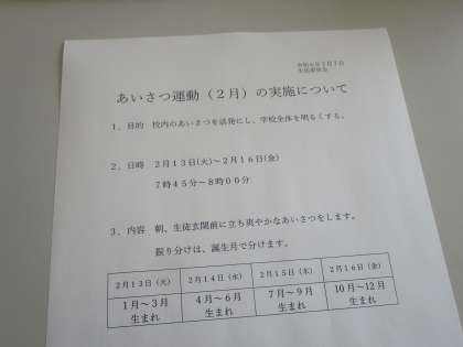 昨日からあいさつ運動を実施しています。今日は4月から6月生まれの生徒が参加してくれました。たくさんの生徒たちが参加してくれ、気持ちのよい1日のスタートを切ることができました。