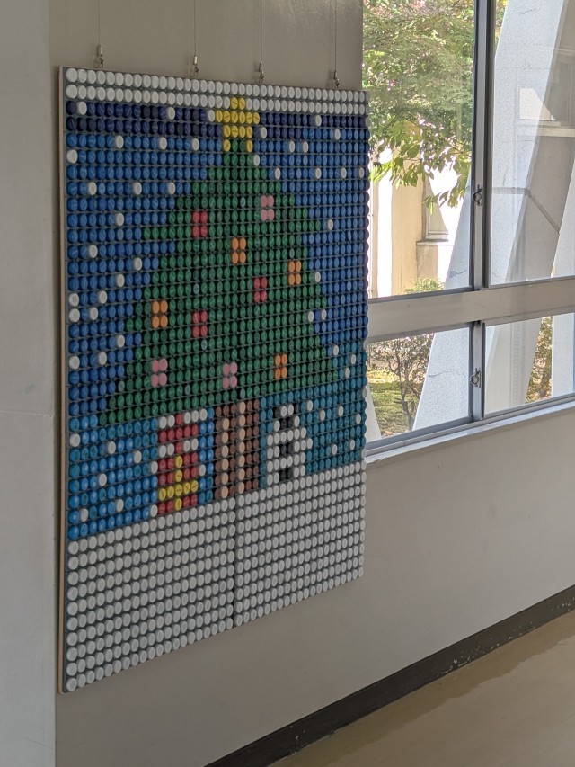 生活文化部のみなさんが制作したペットボトルキャップアートが、新しい作品に仕上がりました。今回のテーマは『クリスマス』です。色とりどりのキャップで表現された作品が、生徒玄関を明るく彩っています。季節の訪れを感じながら、みんなで楽しく過ごしましょう!