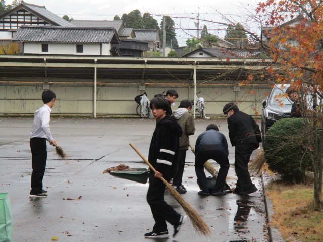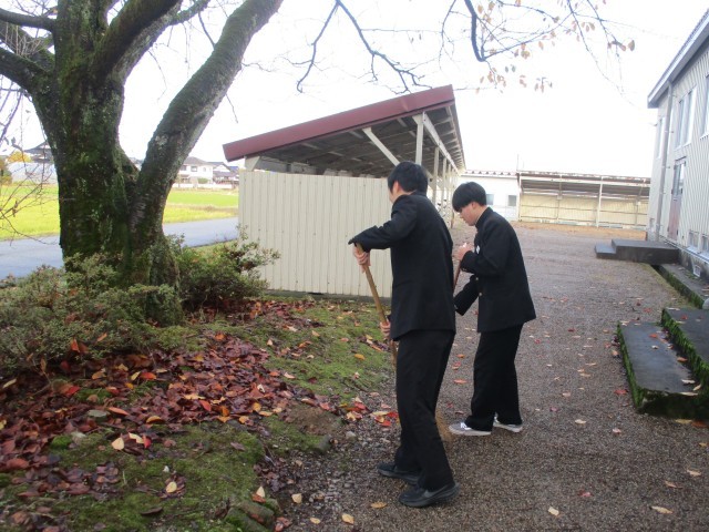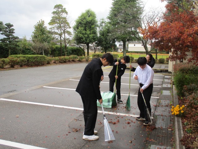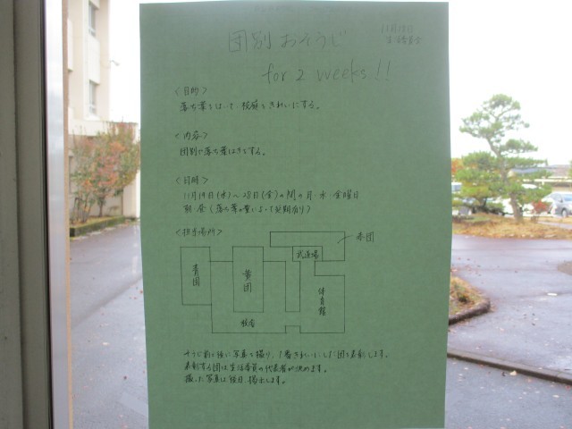 今日は、団別そうじの最終日です。お昼の休み時間には、各団のメンバーが校舎の周りの落ち葉を一生懸命集めてくれました。おかげで、とてもきれいな環境になりました。ありがとうございます。さて、一番きれいにした団は、どこになるのでしょうか? 結果発表を楽しみにしていてください