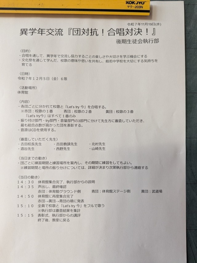 異学年交流『団対抗!合唱対決!』に向けて、生徒たちは朝や昼休みの時間を利用して練習してきました。いよいよ明日が本番です。これまでの頑張りを発揮し、思い出に残る素敵な異学年交流になることを期待しています。