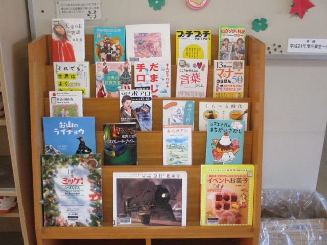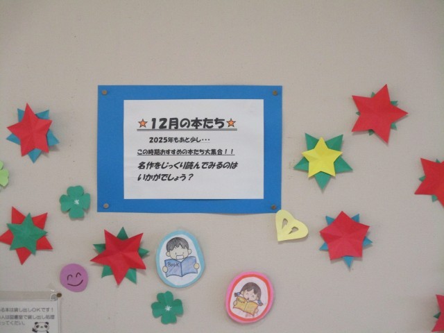 生徒玄関横の図書コーナーには、『12月』にちなんだ本を特集しています。季節を感じられる本や、この時期にマッチしている本がそろっています。ぜひ手に取って、読んでみてください。 -
