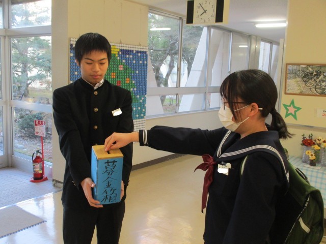 本日、赤い羽根共同募金の取り組みが無事に終了しました。朝の登校時には、たくさんの生徒が足を止めて協力してくれました。ご協力いただいた皆さん、本当にありがとうございました。そして、毎朝、明るく呼びかけを続けてくれた代議員の皆さんにも、心から感謝します。