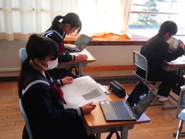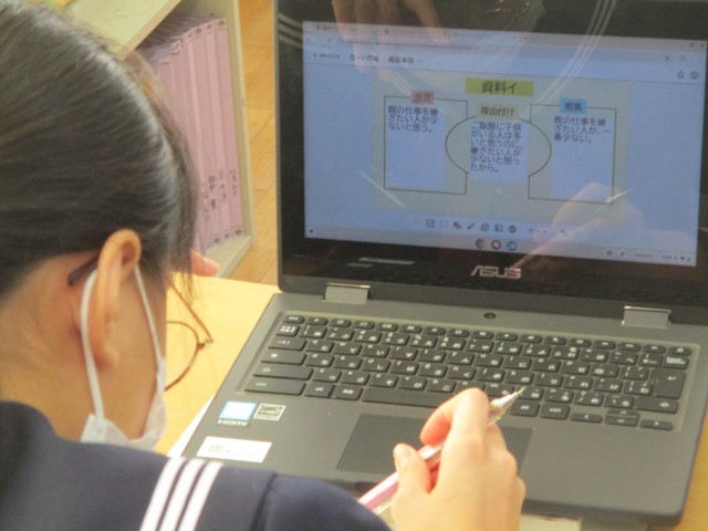 1年生の国語科の授業です。4つの統計資料の中から1つを選び、根拠や理由をはっきりさせて作文を書く学習をしています。今日の学習課題は「選んだ資料の根拠や理由を意識して、文章を書き始めよう」です。生徒は、友達に相談したり、先生にアドバイスをもらったりしながら、タブレットを使って選んだ資料の根拠や理由を明確にしていました。