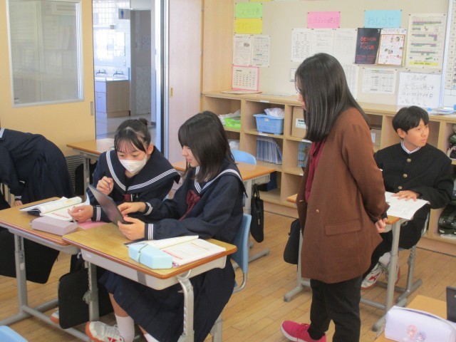 1年生の英語科の授業です。今日は、シチュエーションに合わせて、自分と相手以外の人について質問することが学習課題です。ペアで相談しながら、質問の内容を考えました。その後、友達同士で意見を伝え合う姿も見られました。