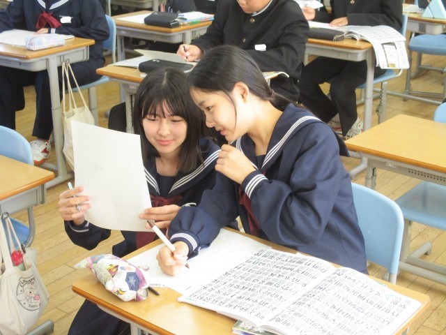1年生の国語科の授業では、習字で行書の学習を行っています。今日は講師の先生からご指導をいただきました。課題は『自分の想いを字に表そう』です。生徒たちは講師の先生のアドバイスを受けながら、気に入った字を選び、心をこめて筆を走らせていました。