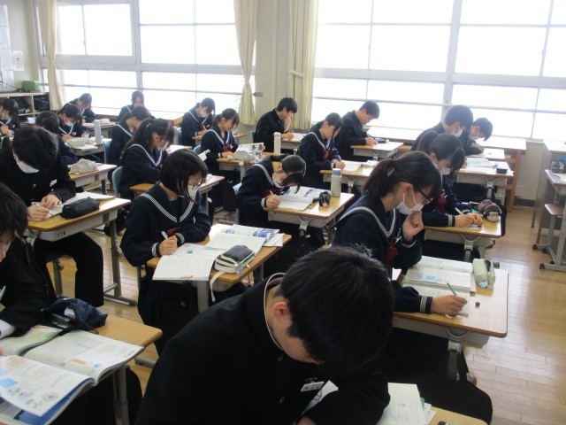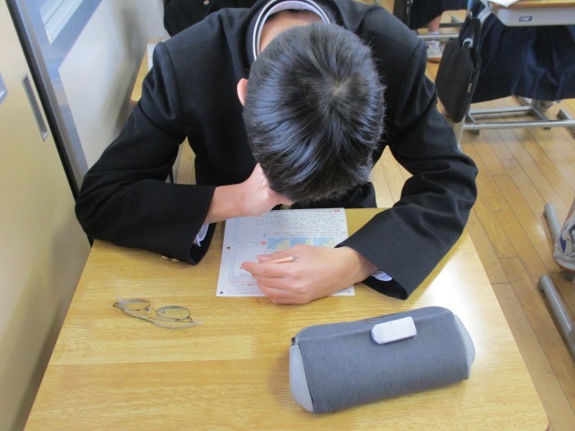 2年生の理科の授業です。これまでの学習の振り返りを、プリントを使って行いました。自分の力で考えたり、教科書などを調べながら、一人一人が真剣に問題に取り組んでいました。