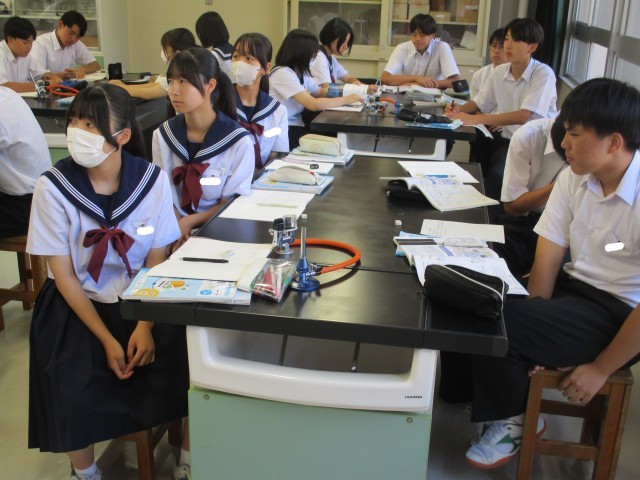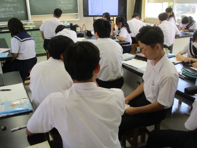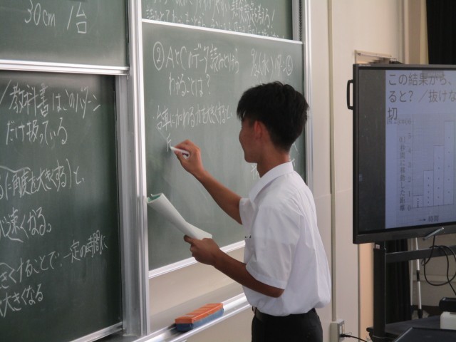 3年生の理科の授業です。斜面を下る台車の比較実験の結果から、どのようなことが分かるのかを考えました。生徒たちは友達と意見を出し合い、自分の考えを整理して発表しました。仲間と相談しながら学びを深める姿が見られました。