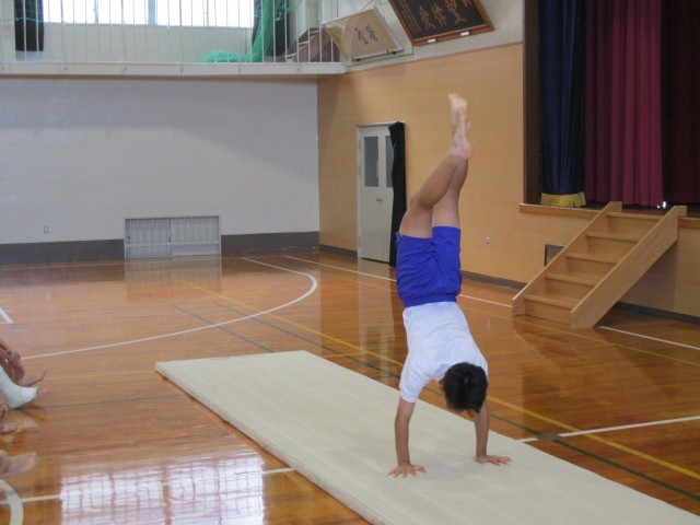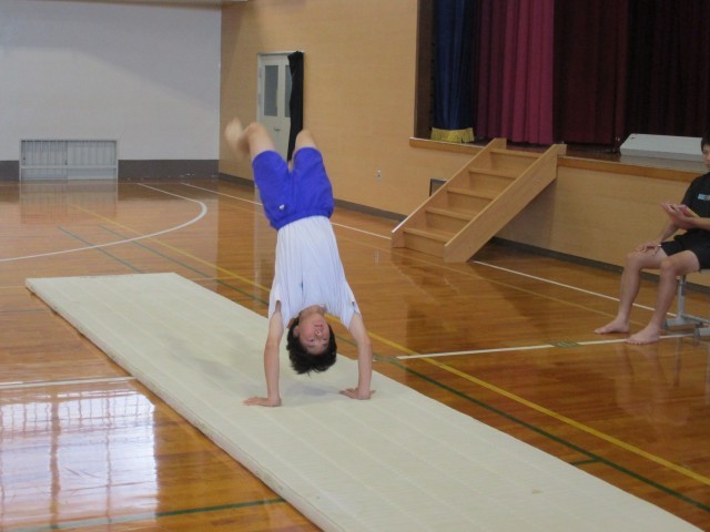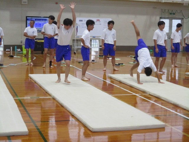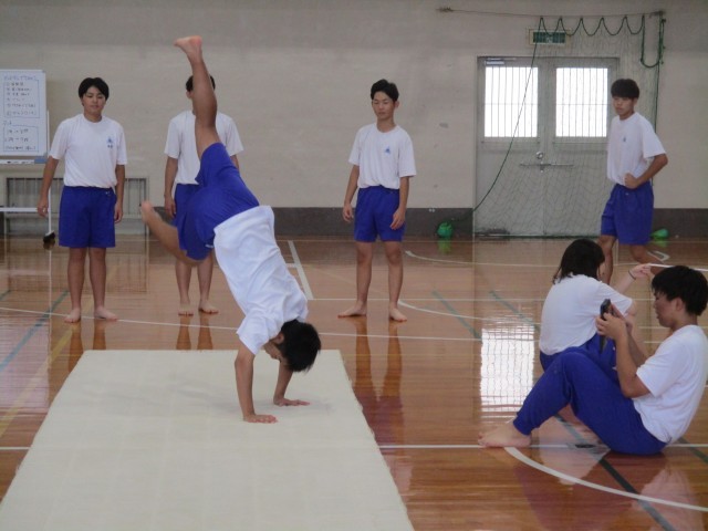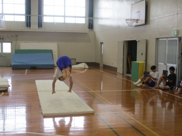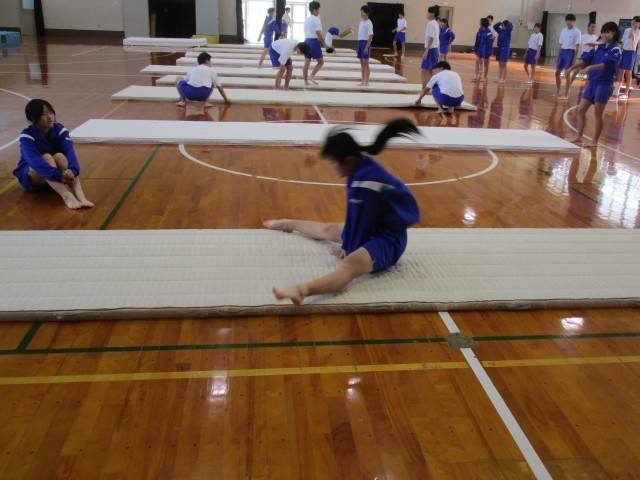 マット運動の発表会が近づいてきました。生徒たちは、自分の技を高めようと繰り返し挑戦しています。タブレットで撮影した自分の動きを確認し、次の練習に生かそうと一生懸命取り組んでいます。