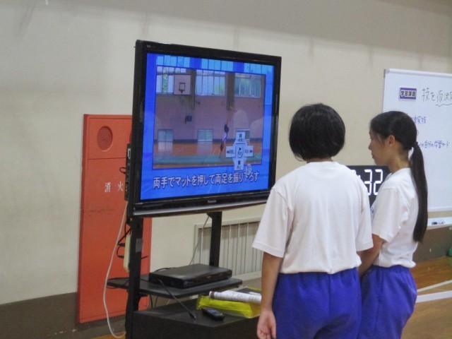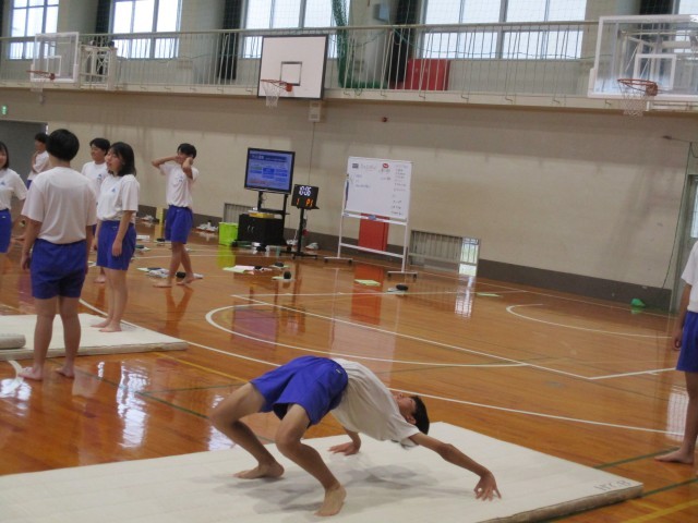 3年生は、マット運動の学習に取り組んでいます。今日は「発表会に向けて技を仮決定する」ことが課題です。生徒たちは、これまでに学んだ技を各マットで確かめたり、DVDを見てポイントを確認したりしながら、5つの技を選んでいました。一人一人が真剣に取り組む姿が見られました。